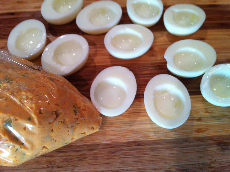 - Mix all ingredients together. Put mixture into a ziploc bag. Squeeze the mixture to one corner of the bag and snip off the corner of the bag. Use this to pipe the mixture into the eggs.
