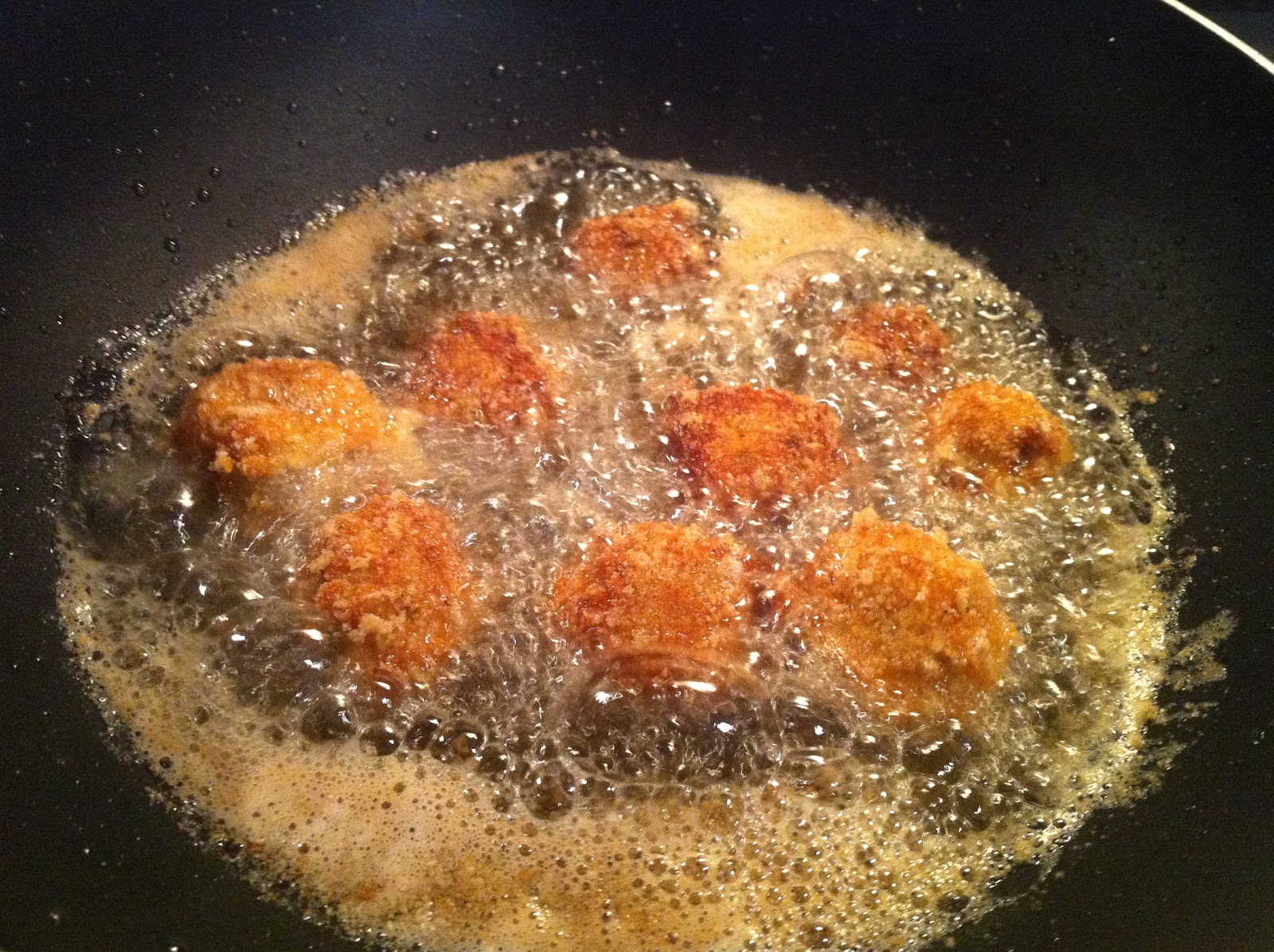 - Once the oil is heated and begins to bubble, drop breaded mushrooms in oil and fry until breading is crispy – About 2 minutes each side. Try not to flip the mushrooms too many times as this will cause the breading to fall off.