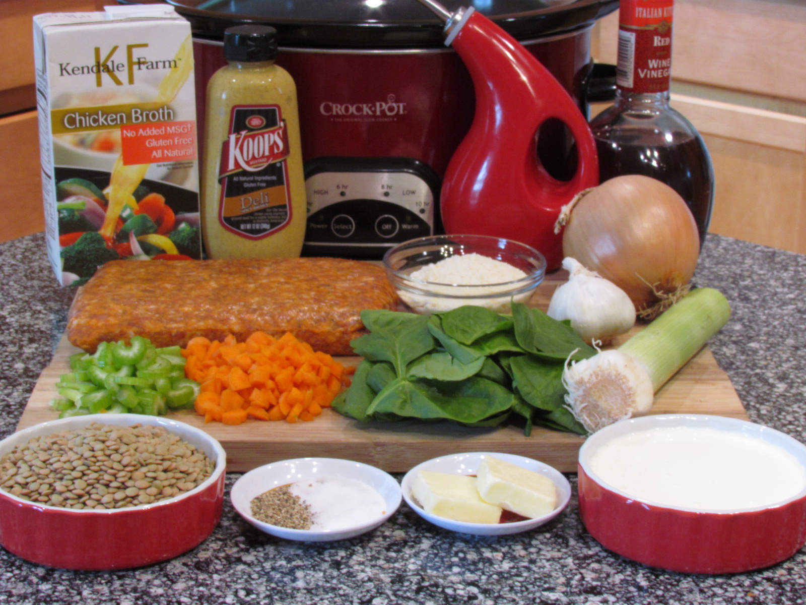 - Heat slow cooker on low setting.Thoroughly rinse lentils, and add to slow cooker with chicken stock.